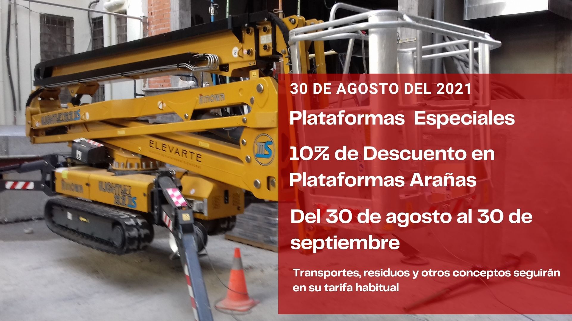 Ofrecemos del 30 de agosto al 30 de septiembre del 2021 un Descuento del 10% del Alquiler en nuestras Plataformas Arañas Sobre Orugas  aplicado a los conceptos  Día Laborable y Día Natural, los conceptos Transportes, Gestión de Residuos y Otros Conceptos siguen en su tarifa habitual. Ésta promoción no es acumulable a otras promociones.