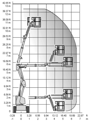 La plataforma elevadora se elige en función de la altura de trabajo, que corresponde a la altura del suelo de la plataforma (distancia entre el suelo y el suelo de la cesta de cesta de la plataforma) a la que se suma la altura media de un operario (con los brazos extendidos en posición de trabajo), unos 2 metros. Por ejemplo en una plataforma articulada diésel de 12 metros como la Haulotte HA12px , la altura de trabajo son 12.15 metros, suelo de plataforma a 10,15 metros.