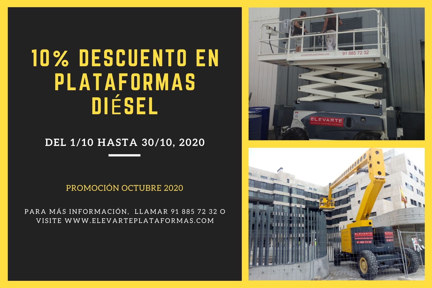 Elevarte Alquiler de Plataformas Elevadoras ofrece  a sus clientes y nuevos clientes un descuento  en plataformas eléctricas del 10% sobre su tarifa asignas, tanto días […]