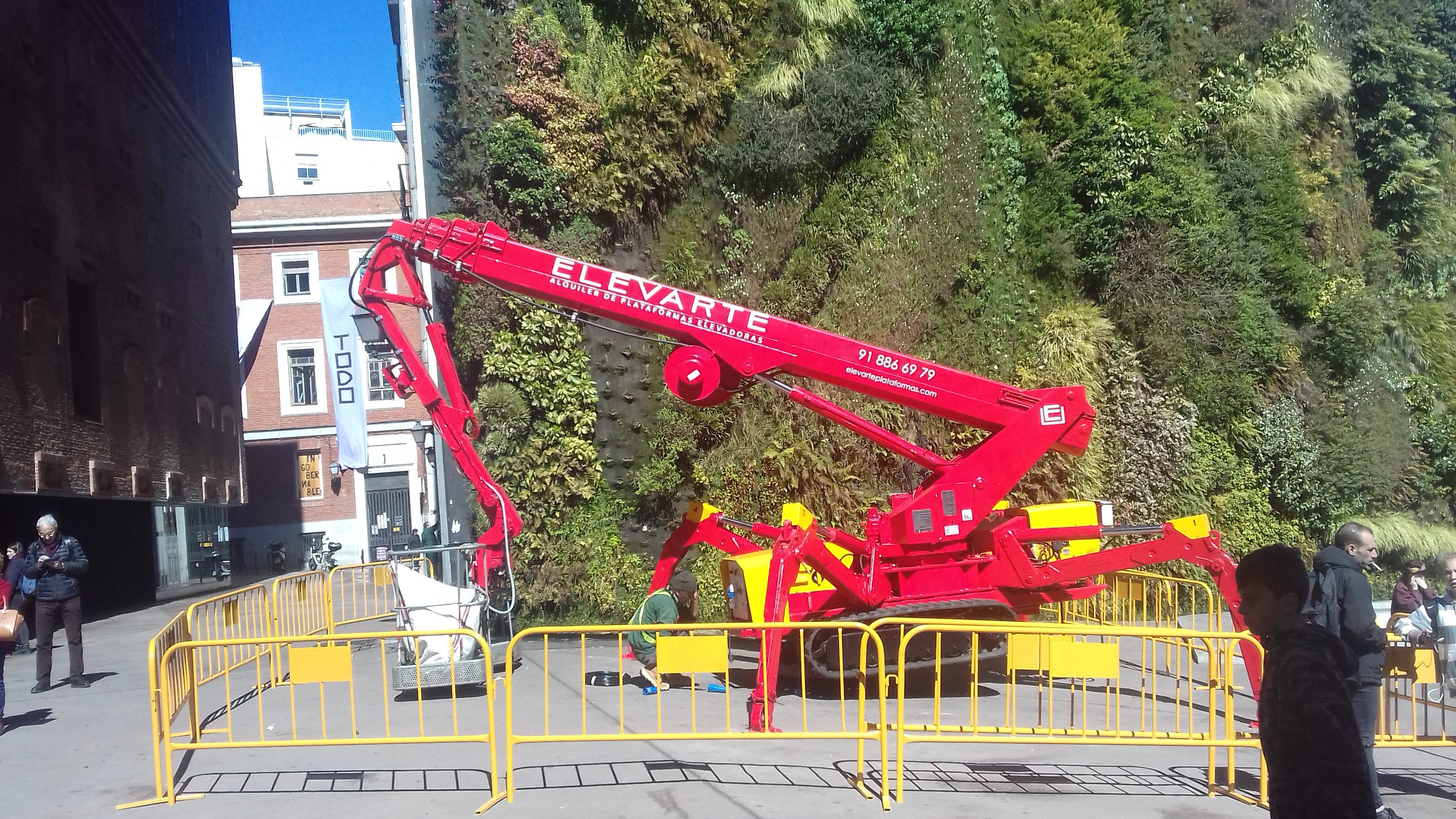 Donde las plataformas convencionales no pueden elevar debido a sus limitaciones por inclinación, las plataformas arañas con estabilizadores permiten nivelar la plataforma y alcanzar los 30 metros de altura  necesarios en este caso para el desarrollo de los trabajos de mantenimiento de este jardín vertical.