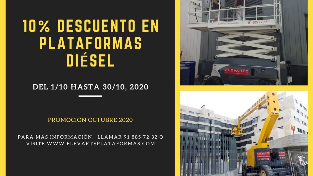 Elevarte Alquiler de Plataformas Elevadoras ofrece  a sus clientes y nuevos clientes un descuento sobre su tarifa asignada del 10%, tanto días laborables, como día natural. Los conceptos de transportes y tasa de residuos seguirán con los precios establecidos. Para ampliar información, www.elevarteplataformas.com